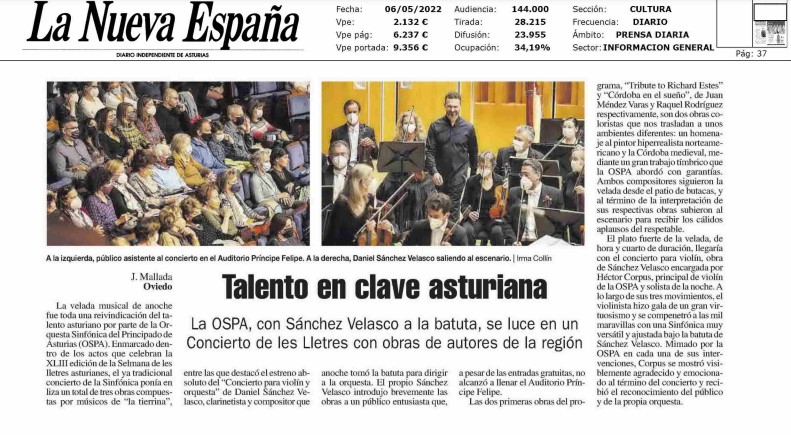 El plato fuerte de la velada llegaría con el concierto para violín, obra de Sánchez Velasco encargada por Héctor Corpus “….”. El violinista hizo gala de un gran virtuosismo y se compenetró a las mil maravillas con una Sinfónica muy versátil y ajustada bajo la batuta de Sánchez Velasco.